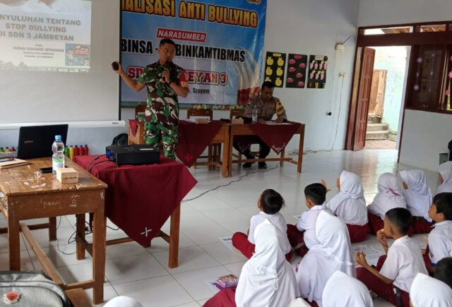 Sebagai upaya mencegah tindakan bullying Serma Nanang Setiawan Babinsa Desa Jambeyan anggota Koramil 08/Sambirejo bersama Babinkamtibmas melaksanakan Giat Bintahwil sebagai Narasumber Sosialisasi Anti Bullying terhadap siswa-siswi SDN 3 Jambeyan, Senin ( 13/11/2023 ).