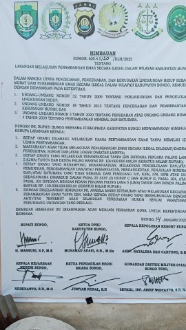 Dalam surat himbauan atau zero peti yang ditanda tanganni Bupati Bungo, Kapolres, Dandim, Kejari dan Ketua DPRD Bungo. Melarang keras aktifitas penambang liar atau peti. Namun kenyataan menurut sejumlah sumber himbauan itu tidak digubris oleh pelaku Peti, sejumlah mesin diesel sejenis dong peng yang digunakan para penambang liar tersebut terus dioprasika mereka”, tutup sumber.