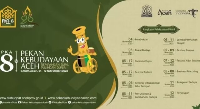 Banda Aceh – Perhelatan Pekan Kebudayaan Aceh (PKA) ke-8 resmi dimulai sejak 4 November. Pemerintah Aceh menggelar rangkaian perayaan PKA hingga 12 November.