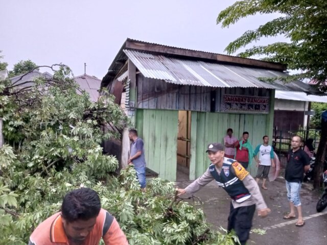 Setelah mendapat laporan, personel Polsek Bandar Baru mendatangi lokasi tumbangnya pohon dan membersihkannya bersama TNI dan masyarakat.