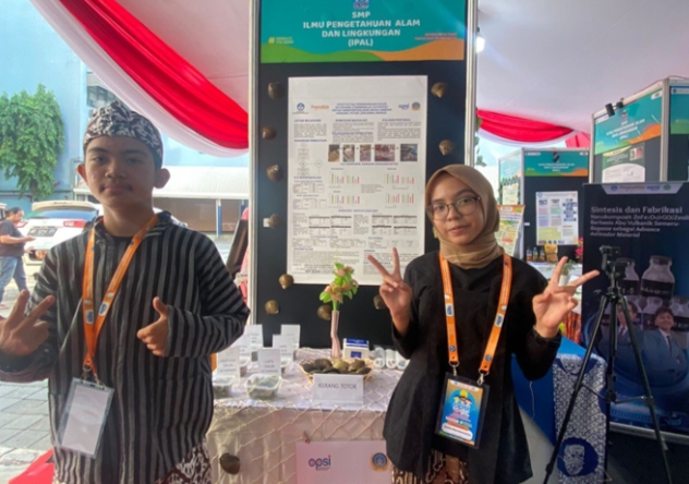 Aretha Gitza Rasendriya dan Fityan Zaky Kamaluddin finalis OPSI dari SMP Negeri Cilacap, membawakan penelitian dengan judul Efektivitas Penggunaan Daun Ketapang (Terminalia Catappa) untuk Memperpanjang Masa Simpan Kerang Totok (Geloina Erosa).