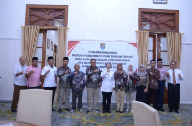 Jateng, Cilacap – Pemerintah Kabupaten Cilacap bersama dengan Komisi Pemilihan Umum (KPU) dan Badan Pengawas Pemilu (Bawaslu) Kabupaten Cilacap melakukan Penandatanganan Naskah Perjanjian Hibah Daerah Penyelenggaraan Pemilihan Bupati dan Wakil Bupati Cilacap Tahun 2024, di Ruang Gadri, Pendopo Wijayakusuma Cakti, Jumat (10/11/2023).